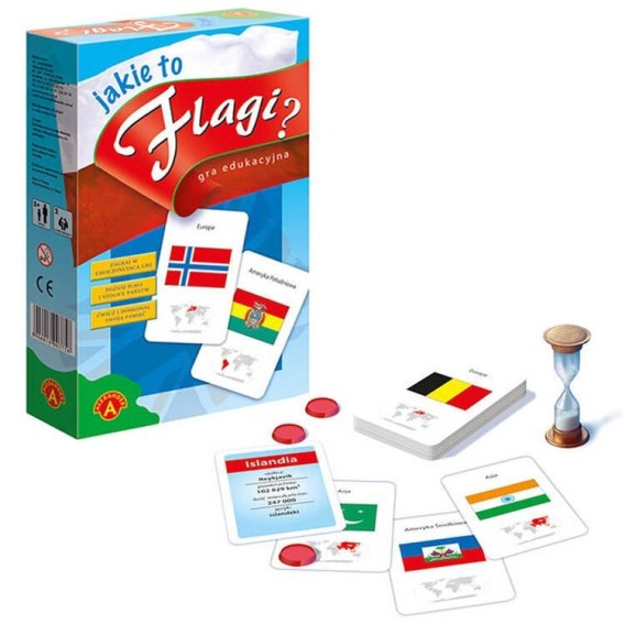 Gra „Jakie to flagi" doskonale łączy przyjemne z pożytecznym. Ta gra to emocjonująca zabawa, a jednocześnie znakomita okazja do nauki identyfikacji flag państwowych (55 krajów). Gracze mogą również przy okazji dowiedzieć się i nauczyć nazw stolic państw, wielkości ich powierzchni, liczby ludności itp. Gra adresowana jest do dzieci i dorosłych. Celem gry jest zdobycie jak największej ilości kart z flagami państw. W grę można grać na dwa sposoby.