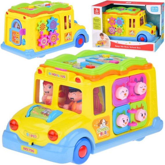Autobus szkolny interaktywny potrafi samodzielnie jeździć, zmieniając za każdym razem kierunek, kiedy napotka przeszkodę, ale może też być sterowane samodzielnie przez dziecko. W trakcie jazdy gra wesoła muzyczka i migają przednie światła. Z przodu autobusu znajduje się kolorowy obrotowy wałek ze zwierzątkami, który po przekręceniu powoduję uruchomienie odgłosy śmiejącego się dziecka i melodyjki.
