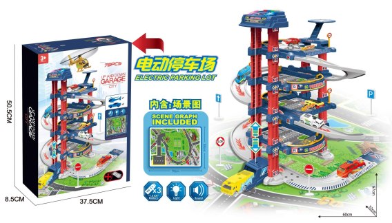 Duży interaktywny parking z elektryczną windą, torem dla autek i matą z drogami to propozycja dla dzieci od 3-go roku życia. Parking posiada wiele poziomów, na które można dostać się za pomocą elektrycznej windy. Każdy z poziomów połączony jest z innym zjeżdżalnią dla resoraków. Na górze garażu znajduje się panel z kolorowymi przyciskami, obsługujący windę. Czerwony guziczek opuszcza windę w dół, a żółty wyciąga ją w górę. Po wciśnięciu niebieskiego przycisku usłyszymy odgłosy charakterystyczne dla policji, straży pożarnej, karetki, a także strzelanie i odpalanie samochodu. Zielony przycisk po naciśnięciu wydaje odgłosy klaksonu. Na panelu sterowania windą migają się również niebieskie i czerwone światełka. Wielopoziomowy parking posiada miejsca parkingowe, stację benzynową, podnośnik dla samochodów oraz lądowisko dla helikopterów. Zabawka zasilana jest bateriami typu 3 x AA 1,5V, baterii brak w zestawie. Parking wykonano w skali 1:64. Funkcje parkingu: - świetlne - migające niebieskie i czerwone światełka na panelu górnym, - dźwiękowe -odgłosy policji, straży pożarnej, karetki, strzelania, odpalania samochodu i klaksonu, - opuszczana i podnoszona winda, - zjeżdżalnia dla autek. |