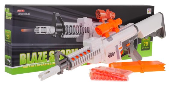 Półautomatyczny karabin na pociski dla dzieci od 8-go roku życia. Pistolet wyposażono w duży wysuwany magazynek, mieszczący 10 pocisków i celownik. Użycie karabinu jest bardzo proste, wystarczy namierzyć cel, naładować i przycisnąć spust. Pocisk poszybuje na odległość ok. 15 metrów. Karabin zasilany jest bateriami typu 5 x AA 1,5 V (brak w zestawie). Cechy produktu: - przeznaczony dla dzieci od 8-go roku życia, - wykonany z najlepszej jakości plastiku, - karabin półautomatyczny, - typ ładowania - magazynek ładowany od spodu, - pojemność magazynku 10 pocisków, - regulowany celownik, - piankowe pociski z gumową końcówką. |