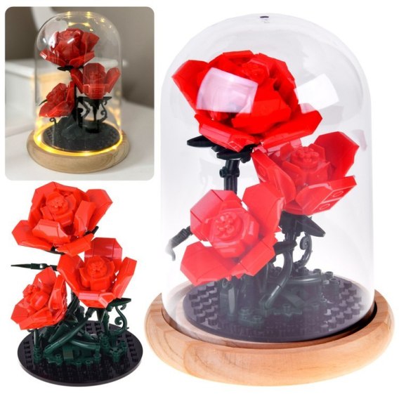 Kreatywne klocki konstrukcyjne - Podświetlana Róża w przezroczystym kloszu z elegancką drewnianą podstawką, zestaw 219 elementów.