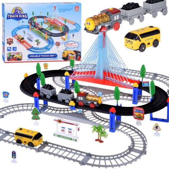 - W zestawie: lokomotywa, autobus, wagony, elementy toru, most wiszący, akcesoria (drzewka, znaki, pojazdy)
