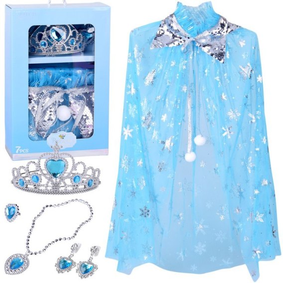 W zestawie znajduje się lekka, jasnoniebieska peleryna, ozdobiona srebrnymi cekinami oraz tego samego koloru - śnieżynkami. Elementy, którymi można ją związać na szyi/barkach to dwa puszyste, białe pomponiki.