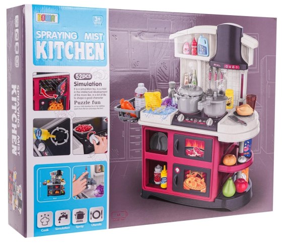 Interaktywna kuchnia z funkcją światła, dźwięku i kranikiem, z którego wydobywa się woda, a także mnóstwem akcesoriów, dla dzieci od 3-go roku życia. Kuchnia została znakomicie wykonana, z najlepszej jakości plastiku i jest w żywych kolorach zachęcających dziecko do zabawy. Na blacie kuchni znajduje się interaktywna płyta z palnikami. Po przekręceniu jednego z pokręteł słychać odgłosy gotowania, a drugiego, odgłos smażenia, któremu towarzyszy podświetlenie palników. Po dodaniu paru kropelek wody na palnik wydobywa się z niego zimna para wodna. Z kranu faktycznie wypływa woda, jak w prawdziwym zlewie, dziecko będzie mogło umyć zabawkowe naczynia. W zestawie mamy też atrapę piekarnika z otwieranymi drzwiczkami i atrapę grilla z otwieranymi drzwiczkami oraz mnóstwo półeczek, na których ułożyć możemy atrapy produktów. Cały zestaw prezentuje się znakomicie. Zabawka zasilana jest bateriami typu 3 x AA 1,5 V (brak w zestawie). Funkcje zestawu: - odpowiednia dla dzieci od 3-go roku życia, - wykonana z najlepszej jakości plastiku w żywych kolorach, - bogato wyposażona, zestaw składa się aż z 52 elementów, - stabilna konstrukcja, - ruchome pokrętła, - palniki z podświetleniem, - odgłosy smażenia i gotowania, - kran z lecącą wodą, - otwierany piekarnik, - otwierany grill, - zimna para wodna wydobywająca się z jednego z palników, - atrapa okapu kuchennego. |