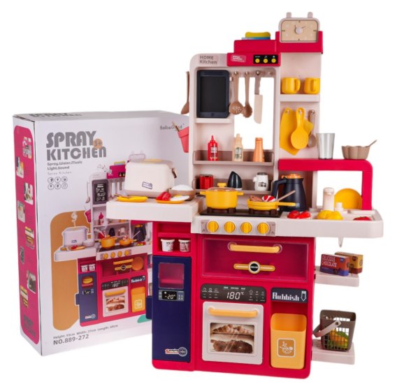 Interaktywna kuchnia z funkcją światła, pary wodnej, dźwięku i kranikiem, z którego wydobywa się woda, a także mnóstwem akcesoriów, dla dzieci od 3-go roku życia. Kuchnia została znakomicie wykonana, z najlepszej jakości plastiku i jest w żywych kolorach zachęcających dziecko do zabawy. Na blacie kuchni znajduje się interaktywna płyta z palnikami. Po przekręceniu jednego z pokręteł słychać odgłosy gotowania, a drugiego, odgłosy smażenia. Odgłosom gotowania i smażenia towarzyszy podświetlenie palników. Dodatkowo z patelni lub garnka wydobywa się para wodna. Z kranu faktycznie wypływa woda, jak w prawdziwym zlewie, dziecko będzie mogło umyć zabawkowe naczynia. Do zestawu dołączono również tablicę kredową, na której można przygotować np. przepis lub listę na zakupy. W zestawie mamy też atrapę lodówki z otwieranymi drzwiczkami, otwierany piekarnik oraz mnóstwo półeczek, na których ułożyć możemy atrapy produktów. Na górze zestawu kuchennego znajduje się panelik muzyczny z przyciskami uruchamiającymi różne melodie I odgłosy wydawane przez okap. W zestawie znaleźć możemy również pojemnik do gotowania ryżu, z którego wydobywa się bezpieczna para wodna oraz  słychać różne odgłosy gotowania. Cały zestaw prezentuje się znakomicie. Cały zestaw zasilany jest bateriami typu 9 x AA 1,5 V (brak w zestawie).