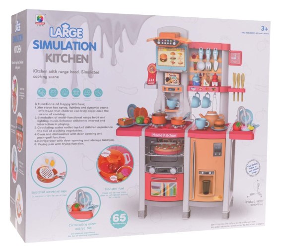Interaktywna kuchnia z funkcją światła, dźwięku i kranikiem, z którego wydobywa się woda, a także mnóstwem akcesoriów, dla dzieci od 3-go roku życia. Kuchnia została znakomicie wykonana, z najlepszej jakości plastiku i jest w żywych kolorach zachęcających dziecko do zabawy. Na blacie kuchni znajduje się interaktywna płyta z palnikami. Po przekręceniu jednego z pokręteł słychać odgłosy gotowania, a drugiego, odgłosy smażenia. Odgłosom gotowania i smażenia towarzyszy podświetlenie palników. Z kranu faktycznie wypływa woda, jak w prawdziwym zlewie, dziecko będzie mogło umyć zabawkowe naczynia. W zestawie mamy też atrapę lodówki z otwieranymi drzwiczkami i dystrybutorem wody, otwierany piekarnik z efektami dźwiękowymi i świetlnymi, zmywarkę, ekspres do kawy, panel z wentylatorem oraz efektami dźwiękowymi i świetlnymi, telefonik z dźwiękiem i światłem oraz mnóstwo półeczek, na których ułożyć możemy atrapy produktów. Cały zestaw prezentuje się znakomicie. Zabawka zasilana jest bateriami typu 6 x AA 1,5 V (brak w zestawie) oraz 2 x AAA 1,5 V (brak w zestawie). Funkcje zestawu: - odpowiednia dla dzieci od 3-go roku życia, - wykonana z najlepszej jakości plastiku w żywych kolorach, - bogato wyposażona, zestaw składa się aż z 65 elementów, - ruchome pokrętła, - palniki z podświetleniem, - odgłosy smażenia i gotowania, - kran z lecącą wodą, - otwierana lodówka z atrapą dystrybutora wody, - otwierany piekarnik z dźwiękami i światłem, - otwierana zmywarka, - wbudowany ekspres do kawy, - panel z wentylatorem oraz światełkami i dźwiękami, - telefonik z odgłosami (dzwonki, odgłosy zwierząt, piosenka) i podświetlaną anteną, - ramka na karty z przepisami, - zegar z ruchomymi wskazówkami, - 3 produkty (ryba, rak, kawałek mięsa) zmieniają kolor po włożeniu do szybkowaru. |