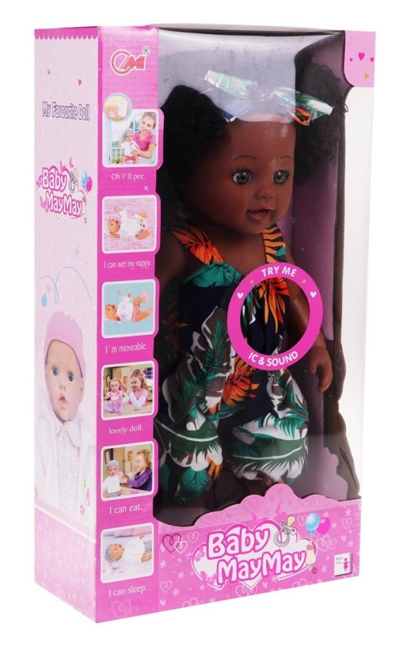Śliczna, duża lalka, dla dziecka od 3-go roku życia. Lalka jest perfekcyjnie wykończona, z dbałością o każdy szczegół i w pełni bezpieczna dla dziecka. Ubrana jest w kombinezon letni, sandałki i ma opaskę na bujnych włosach. Ubranka możemy zdejmować i przebierać lalkę w inne. Ruchome nóżki i rączki, ułatwiają przebieranie. Na brzuszku lalki znajduje się panel dźwiękowy, po naciśnięciu, na który lala wydaje różne odgłosy. Zabawka zasilana jest bateriami typu 3 x AG13 (w zestawie). Funkcje zabawki: