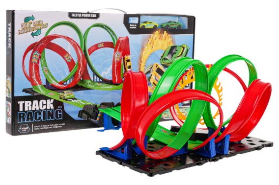 Podwójny tor wyścigowy z wyrzutnią i pętlami dla dzieci od 3-go roku życia. Tor wykonano z najlepszej jakości plastiku w żywych kolorach. Zestaw składa się z dwóch, połączonych ze sobą torów, posiadających odcinki proste do rozpędzenia pojazdu, pętle 360 stopni, wspólną wyrzutnię i dwa pojazdy. Idealna zabawa dla dwóch osób. Pojazdy napędzane są napędem pull back. Wystarczy delikatnie nacisnąć pojazd do tyłu, by przejechał tor z pełną mocą.