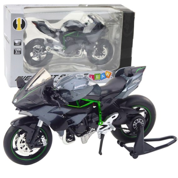 Model został wyposażony w efekty świetlne i dźwiękowe, które są aktywowane dzięki zasilaniu 3x AG13 (w zestawie). Dodatkowe funkcje zwiększają realizm zabawy, sprawiając, że motocykl wygląda i brzmi jak prawdziwy pojazd. Dynamiczny, sportowy design w kolorze szarym inspirowany jest klasycznymi motocyklami wyścigowymi, co dodaje mu autentycznego charakteru.