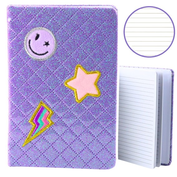 Stylowy notatnik w formacie zbliżonym do B6 z brokatową, fioletową okładką to praktyczne i estetyczne narzędzie do codziennych zapisków. Powierzchnia okładki pokryta została śliskim, laminowanym materiałem, dzięki czemu brokat nie osypuje się i pozostaje trwały nawet przy intensywnym użytkowaniu. Dodatkową ozdobą są kolorowe naszywki w kształcie gwiazdki, uśmiechniętej buźki i błyskawicy, które nadają całości nowoczesnego, młodzieżowego charakteru.