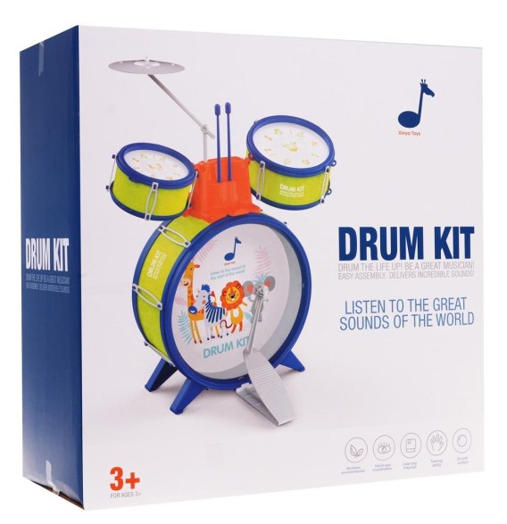 Kolorowa perkusja Safari dla dzieci od 3-go roku życia. Zestaw składa się z 3 bębnów, talerza i pałeczek. Wykonany został z najlepszej jakości materiałów w żywych kolorach przyciągających wzrok dziecka i zachęcających do zabawy. Na dużym bębnie znajduje się rysunek ze zwierzątkami. Dźwięk z dużego bębna uruchamia się po uderzeniu nożnym pedałem, a z górnych bębnów i talerza, po uderzeniu pałeczkami. Zabawa tym zestawem rozwija zainteresowanie muzyką i talent dziecka, uczy poczucia rytmu i ćwiczy koordynacje ręka-oko. Funkcje zestawu: - odpowiedni dla dzieci od 3-go roku życia, - wykonany z bezpiecznych materiałów, - żywa kolorystyka przyciąga wzrok dziecka. |