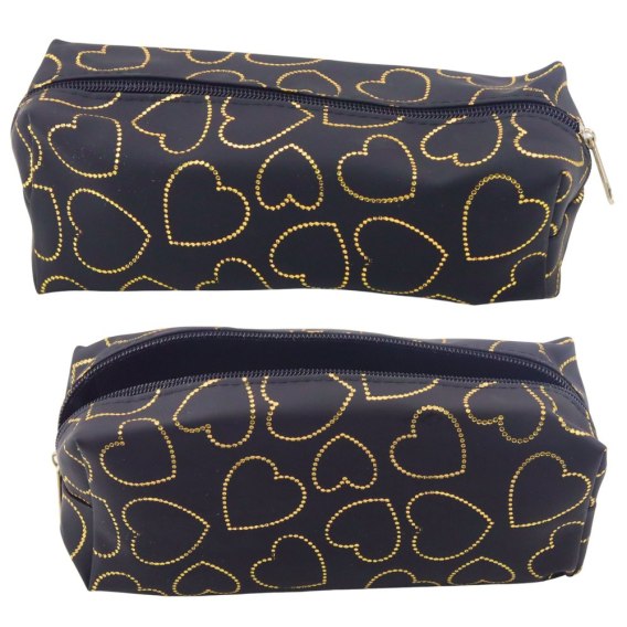 Stylowy i funkcjonalny piórnik w eleganckim czarnym kolorze, ozdobiony subtelnym wzorem złotych serc, to doskonały wybór dla uczniów, studentów i każdego, kto ceni praktyczne dodatki z modnym akcentem.