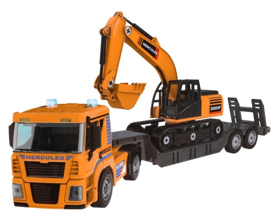 Duży, znakomicie wykonany zestaw ciężarówka z koparką do samodzielnego montażu to propozycja dla dzieci od trzeciego roku życia. Zestaw składa się z 185 elementów. Zabawka posiada efekty dźwięku i światła. Na górze ciężarówki mrugają światełka oraz słychać odgłosy zapłonu samochodu, cofania i klaksonu.  Kabina ciężarówki pochyla się do przodu. Wkrętarko-wiertarka wydaje odgłosy podczas wiercenia czy wykręcania oraz świeci się niebieska dioda. Kabina koparki obraca się o 360 stopni a ramię z łyżką podnosi się w górę i w dół oraz wykonuje manewry nabierania i wysypywania. Zestaw zawiera 3 wymienne końcówki do koparki: łyżkę, wiertło oraz chwytak.  Ciężarówka posiada gumowe opony, poradzi sobie z jazdą w różnym terenie. Zabawka zasilana jest bateriami typu 3 x 1.5 AG13 (w zestawie), wkrętarko-wiertarka bateriami 3 x AA 1.5V (brak w zestawie).