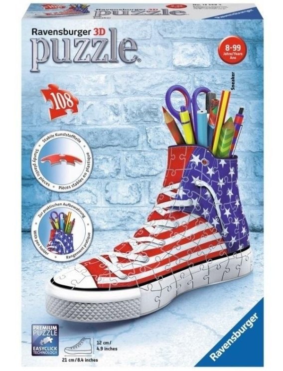 Puzzle 3D Przybornik Trampek American Style. Ten niezwykły produkt łączący w sobie możliwość zabawy w układanie przestrzennych puzzli i praktyczny pojemnik na kredki, przybory, czy inne akcesoria. Niepowtarzalna kolekcja konstrukcji 3D w wersji puzzli z pewnością zachwyci każde dziecko i nastolatka. By stworzyć swoją wyjątkową dekorację pokoju - wystarczy ułożyć z mocnych, plastikowych puzzli praktyczny przybornik, a pokój od razu nabierze nowego charakteru.