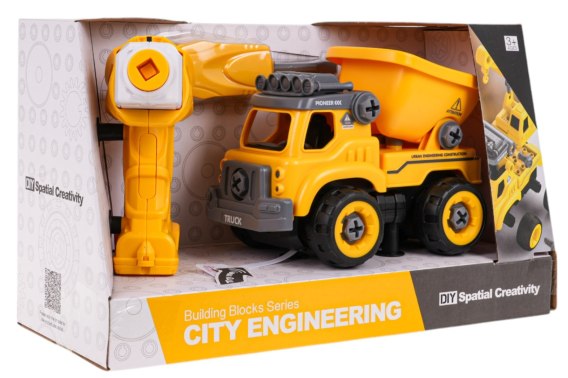Interaktywny pojazd budowlany dla dzieci od 3-go roku życia z akcesoriami w zestawie. Pojazd otrzymujemy skręcony i kompletny, możemy go rozłożyć na części pierwsze za pomocą dołączonego do zestawu śrubokręta lub wkrętarko wiertarki. Śrubokręt jest manualny, natomiast wkrętarko wiertarka jest na baterie. Wiertarka posiada wyjmowany panel, jeżeli przełożymy ten panel do pojazdu, możemy go sterować do przodu i do tyłu. Panel posiada również możliwość ustawienia, by pojazd jeździł sam do przodu albo do tyłu. Pojazd budowlany ponadto posiada efekty dźwiękowe w postaci odgłosów silnika, jazdy i klaksonu oraz ruchome elementy takie jak przyczepa czy dach pojazdu. Zabawka wykonana została z najlepszej jakości materiałów, w żywych kolorach. Panel sterujący zasilany jest bateriami typu 2 x AA 1,5 V (brak w zestawie), autko bateriami typu 3 x AG13 (w zestawie).