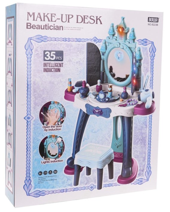 Bogato wyposażona interaktywna toaletka z funkcją światła i dźwięku dla dzieci od 3-go roku życia. Zabawka wykonana została z najlepszej jakości plastiku w żywych kolorach. Toaletka wyposażona jest w duży blat, szufladkę, półeczki oraz duże otwierane lustro, które posiada efekty dźwiękowe takie jak wesołe melodie, oraz efekty świetlne. Nad lustrem znajduje się czujnik, który otwiera i zamyka magiczne wrota do lustra. Na lustrze toaletki wyświetlają się postacie księżniczek. Do toaletki dołączono taboret oraz mnóstwo akcesoriów do malowania. Toaletka zasilana jest bateriami typu 3 x AA 1,5 V (baterii brak w zestawie). Funkcje zestawu: - odpowiednia dla dzieci od 3-go roku życia, - wykonana z najlepszej jakości materiałów, - oświetlenie na górze i po bokach lustra, a także na wrotach do lustra, - pojawiające się księżniczki na lustrze, - efekty dźwiękowe: magiczne melodie, - otwierające się wrota do lustra, - wygodny taboret, - stabilna konstrukcja zestawu. |