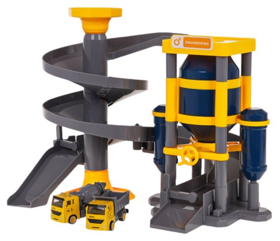 Plac budowy z silosem, zjeżdżalniami i autkami dla dzieci od 3-go roku życia. Zestaw wykonany został z najlepszej jakości plastiku, z dbałością o szczegóły. Plac budowy składa się z części z silosem, do którego wsypać możemy piasek, a następnie zakręcić korbką i odsypać potrzebną ilość oraz części ze zjeżdżalniami, po której mogą się poruszać pojazdy budowlane dołączone do zestawu. W zestawie znajdziemy wywrotkę i betoniarkę.