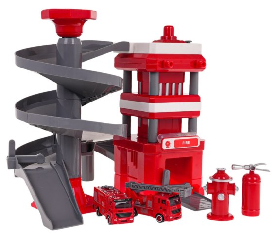 Remiza Strażacka z funkcją wody, zjeżdżalnią i autkami strażackimi w zestawie dla dzieci od 3-go roku życia. Na dachu remizy strażackiej znajduje się pojemniczek na wodę. Po nalaniu wody do pojemniczka i naciśnięciu przycisku znajdującego się obok zbiorniczka, z przedniej części dachu będzie wydobywać się woda. Na dole remizy znajduje się garaż dla pojazdów strażackich z ruchomym szlabanem. Do zestawu dołączono dwa autka strażackie z metalową karoserią, dodatkowo drabina w jednym wozie strażackim podnosi się i opuszcza, a także wysuwa. W zestawie znajdziemy również hydrant oraz gaśnicę.