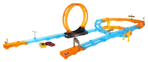 Duży, ekstremalny tor wyścigowy z ostrymi zakrętami, pętlami i dwoma autkami w zestawie, to propozycja dla dzieci od 3-go roku życia. Zestaw składa się z 30 elementów do samodzielnego montażu. Na torze znajdują się odcinki proste, ostre zakręty z barierkami zabezpieczającymi przed wypadaniem pojazdu z trasy, dwa poziomy, a także pętla 360 stopni. Pojazdy znajdujące się w zestawie posiadają napęd pull back. |
