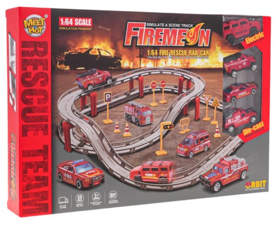 Tor wyścigowy w wersji Straż Pożarna dla dzieci od 3-go roku życia. Tor wykonano z najlepszej jakości plastiku, a dołączone 3 pojazdy strażackie, posiadają metalową karoserię. Na tor składa się 35 elementów tworzących dwupoziomową konstrukcję z odcinkami prostymi i zakrętami. Do zestawu dołączone są 4 wozy strażackie. Jeden z pojazdów zasilany jest bateriami typu 1 x AA 1,5 V (brak w zestawie). Funkcje zestawu: - odpowiedni dla dzieci od 3-go roku życia, - wykonany z najlepszej jakości plastiku, - 3 autka posiadają metalową karoserię, - 1 pojazd elektryczny, - pojazdy wykonane w skali 1:64, - konstrukcja składa się z dwóch poziomów z odcinków prostych i zakrętów. |
