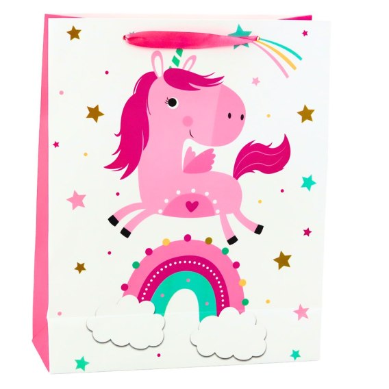 Torebka prezentowa z uroczym motywem jednorożca to idealna oprawa każdego dziecięcego upominku, która zachwyci nie tylko najmłodszych. Kolorowa grafika z radosnym, różowym jednorożcem stojącym na tęczy, przyciąga uwagę.