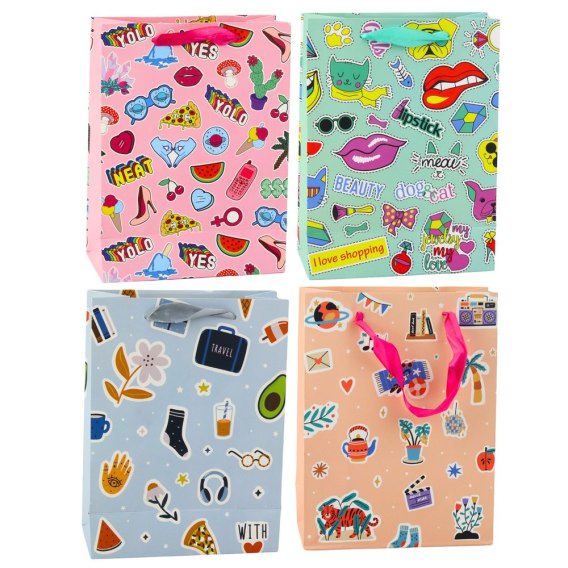 Torba prezentowa z naklejkowym motywem, która zachwyca żywymi kolorami i nowoczesnym stylem! Torba ozdobiona jest różnorodnymi grafikami w formie kolorowych naklejek, takich jak serca, usta, owoce, napisy oraz symbole młodzieżowe i lifestylowe. Taki wzór sprawia, że torba wygląda wyjątkowo modnie i oryginalnie.
