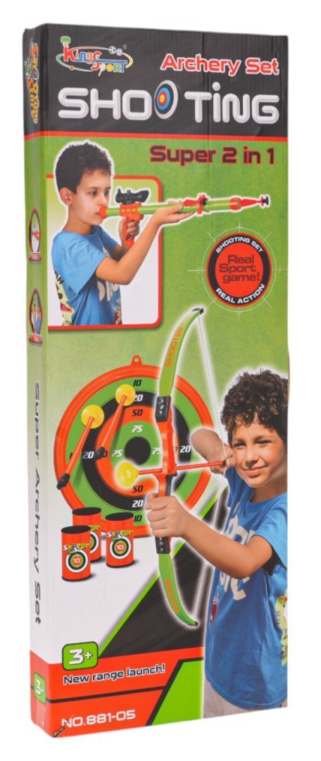 Zestaw 2w1 łuk i pistolet dla dzieci od 3-go roku życia. Zestaw wykonany został z najlepszej jakości materiałów w żywych kolorach. W zestawie znajduje się łuk, pistolet z celownikiem laserowym, strzały do łuku, strzałki do pistoletu, tarcza oraz beczułki (cele). Strzały i strzałki zakończone są gumowymi przyssawkami. Zestaw idealny do aktywnego spędzenia czasu na świeżym powietrzu.