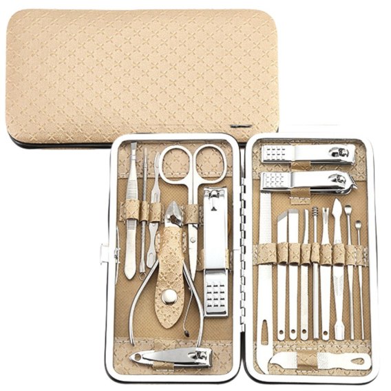 Kompletny zestaw do manicure i pedicure z narzędziami ze stali nierdzewnej. Zawiera cążki, nożyczki, pilniki oraz folię do zdobienia paznokci. Eleganckie beżowe etui do przechowywania i podróży. Idealny na prezent i dla profesjonalistów!