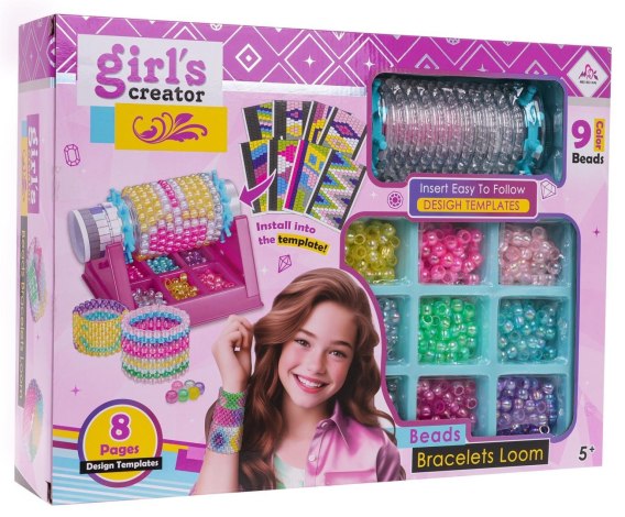 - tuba do tworzenia bransoletek, - podstawka na koraliki z przegródkami, - 8 wzorników bransoletek, - 540 koralików w 9 kolorach. - 2 x saszetka z żyłką, - 2 plastikowe igły, - instrukcja. |