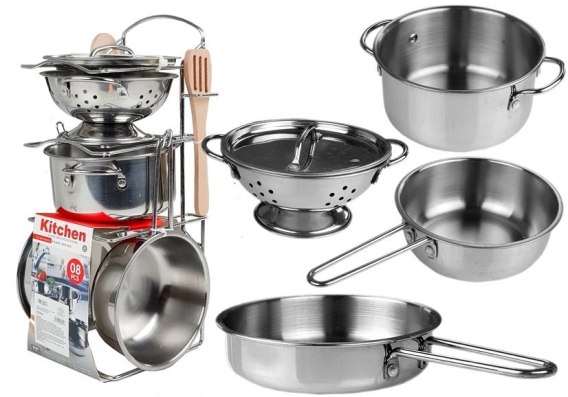 Prezentowany przez nas zestaw składa się z błyszczącej, metalowej, srebrnej zastawy, w skład której wchodzą między innymi garnek, patelnie czy cedzak. Mnogość elementów pozwala na wesołą zabawę, podczas której maluchy mogą udawać, że przygotowują wyśmienite potrawy, a także serwować je swoim rodzicom, a także misiom i lalkom.
