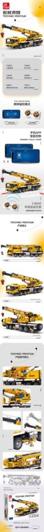 Zestaw 1901 klocków konstrukcyjnych do samodzielnego złożenia pojazdu budowlanego dźwigu do zdalnego sterowania. Zabawka przeznaczona dla dzieci od 14-go roku życia. Dźwig posiada wiele ruchomych elementów, jak kabina obracająca się o 360 stopni. Dodatkowo, można manualnie ruszać ramieniem dźwigu w płaszczyznach góra-dół i przód-tył, za pomocą specjalnych zębatek.