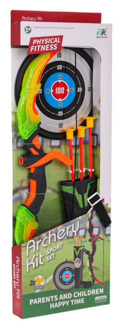 Zestaw łuk z oświetleniem, kołczan, bełty, tarcza dla dzieci od 3-go roku życia. Atrakcją łuku jest oświetlenie, co sprawia, że może być używany również wieczorną porą.  Łuk jest bardzo prosty w użyciu, wystarczy umieścić strzałę pomiędzy celownikiem a cięciwą, namierzyć cel i oddać strzał. Zabawa łukiem uczy precyzji i skupienia, jest to również świetny trening mięśni barków i pleców. Łuk zasilany jest bateriami typu 2 x AAA 1,5 V (brak w zestawie).