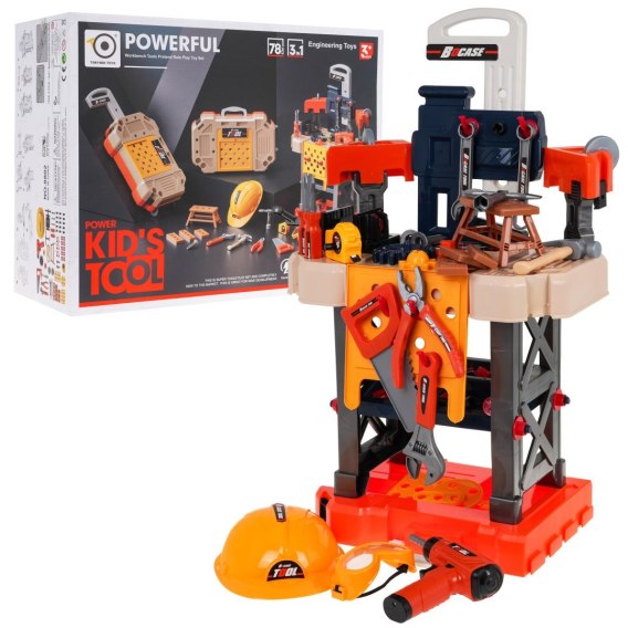 Bogato wyposażony zestaw narzędzi 3 w 1 dla małych majsterkowiczów od 3-go roku życia. Z zestawu możemy zbudować stolik warsztatowy a po skończonej zabawie przekształcić go w walizkę na narzędzia dołączone do zestawu. Możemy zbudować walizkę z rączką do przenoszenia lub walizkę na kółkach do pchania. Zestaw zawiera 78 elementów takich jak części składowe warsztatu, kask, piła, śrubokręty, wiertarko-wkrętarkę na baterie, dużą ilość śrubek itp. Wkrętarka zasilana jest bateriami typu 2 x 1,5V AA, brak baterii w zestawie. Wkrętarko-wiertarka działa jak prawdziwa, wkręca, wykręca, a podczas pracy świeci się czerwona dioda na przodzie zabawki. |