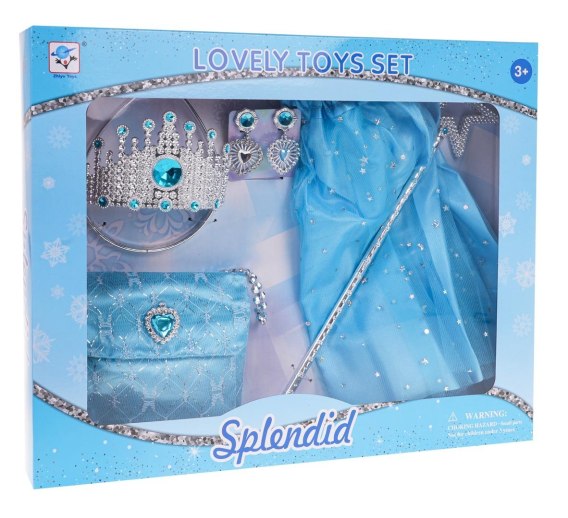 Znakomity zestaw, strój dla małej księżniczki od 3-go roku życia. W skład zestawu wchodzi tiara, magiczna różdżka, kolczyki, torebka oraz spódniczka. Zestaw wykonany został z dbałością o szczegóły w pięknym niebieskim kolorze.