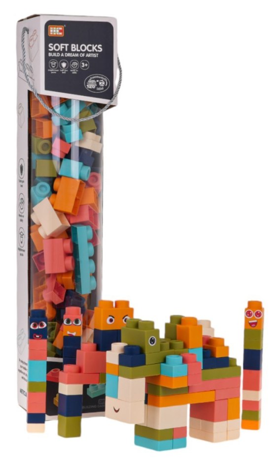 Zestaw kolorowych miękkich klocków dla dzieci od 3-go roku życia. Zestaw wykonano  z bezpiecznego dla dzieci i środowiska materiału PVC. Klocki są lekkie i nie posiadają ostrych zakończeń. Bardzo łatwo je utrzymać w czystości, po wyparzeniu, nie tracą kolorów. Klocuszki możemy dowolnie wyginać, a po wygięciu wracają do swojego poprzedniego kształtu.