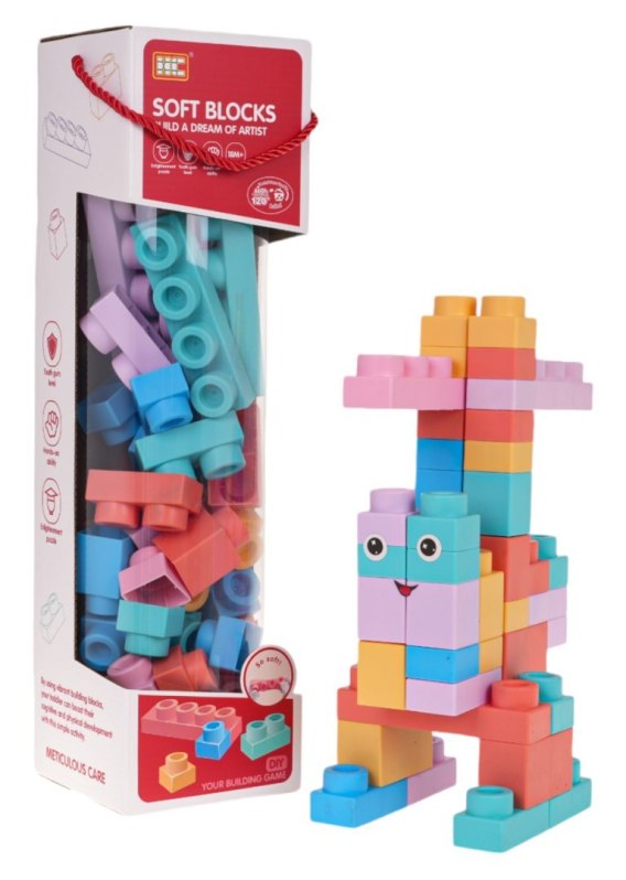 Zestaw kolorowych miękkich klocków dla dzieci od 3-go roku życia. Zestaw wykonano  z bezpiecznego dla dzieci i środowiska materiału PVC. Klocki są lekkie i nie posiadają ostrych zakończeń. Bardzo łatwo je utrzymać w czystości, po wyparzeniu, nie tracą kolorów. Klocuszki możemy dowolnie wyginać, a po wygięciu wracają do swojego poprzedniego kształtu.