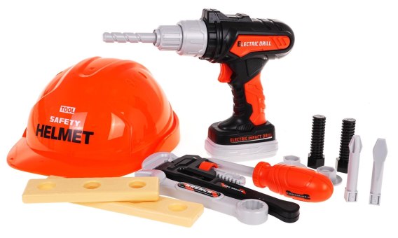 Bogato wyposażony zestaw narzędzi z kaskiem i interaktywną wiertarko-wkrętarką dla dzieci powyżej 3-go roku życia. Zestaw wykonany został z plastiku najlepszej jakości i składa się z 15 elementów. W zestawie prócz kasku znajdują się: wiertarka, śrubokręt, klucz francuski, klucz, dwie śrubki, dwie nakładki na śrubki, deseczka mała i duża. Wiertarko-wkrętarka zasilana jest bateriami typu 2 x AA, brak w zestawie, posiada wyjmowany akumulator tak jak w prawdziwej wiertarce dla dorosłych oraz wymienne bity: krzyżakowy, płaski i wiertło. Możemy nią wkręcać i wykręcać śrubki. Zestaw rozwija zdolności manualne u dzieci, wyobraźnię i pasję do majsterkowania. Funkcje zestawu: - odpowiedni dla dzieci od 3-go roku życia, - wykonany z najlepszej jakości materiałów, - bogato wyposażony zestaw, aż 15 elementów, - wiertarko-wkrętarka zasilana jest bateriami, - wiertarko-wkrętarka wygląda jak prawdziwa, ma wyjmowany akumulator, wkręca i wykręca, - wymienne bity do wiertarki, - rozwija zdolności manualne, wyobraźnię i pasję do majsterkowania. |