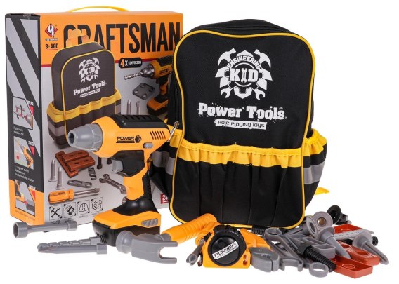 Bogato wyposażony zestaw narzędzi z plecakiem na narzędzia i interaktywną wiertarko-wkrętarką dla dzieci od 3-go roku życia. Zestaw wykonano z najlepszej jakości plastiku. Plecak na narzędzia posiada główną komorę zamykaną na zamek błyskawiczny, małe kieszonki po bokach oraz przeszycia, które pomieszczą narzędzia. Wiertarko-wkrętarka zasilana jest bateriami typu 3 x AAA 1,5V (brak w zestawie) wkręca i wykręca, dodatkowo posiada wyjmowany akumulator jak w prawdziwej wiertarce, wymienne bity i świeci podczas pracy. W zestawie znajduje się, aż 28 elementów, prócz plecaka i wiertarko-wkrętarki mamy także: metr, młotek, kombinerki, kluczek, kątownik, śrubki, kołki, elementy do wkręcania.