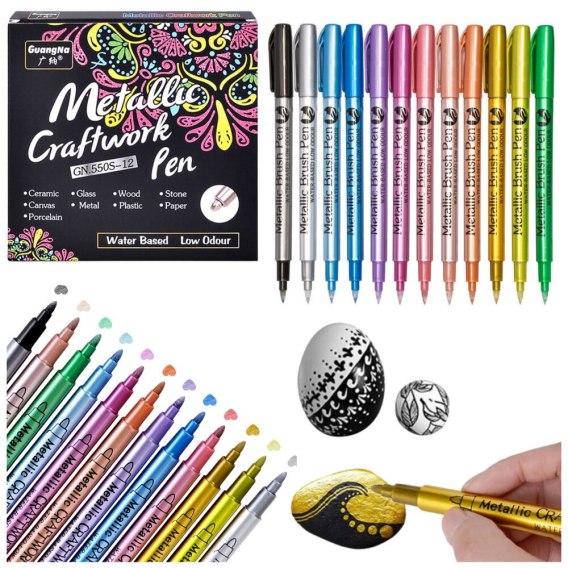 Zestaw 12 pisaków metalicznych to doskonałe narzędzie do tworzenia efektownych dekoracji, rysunków i projektów artystycznych. Intensywne, połyskujące kolory nadają pracom wyjątkowego charakteru, dzięki czemu świetnie sprawdzą się w scrapbookingu, kaligrafii, zdobieniu kartek okolicznościowych, kamieni, szkła, ceramiki oraz innych powierzchni.
