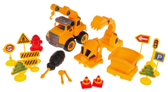 - autko budowlane, - przyczepa, - gruszka do betonu, - wysięgnik, - łyżka koparki, - znaki drogowe, hydrant, drzewko, barierki, - śrubokręt z wymiennymi bitami, - pachołki, - instrukcja. |