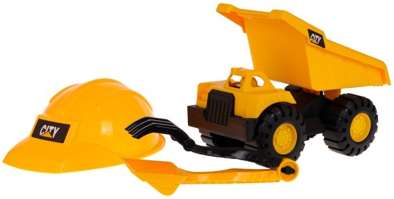 Zestaw do piasku z wywrotką, kaskiem, grabkami i łopatką dla dzieci od 3-go roku życia. Zestaw wykonany został z najlepszej jakości materiałów. Wywrotka posiada ruchome elementy. Manualnie możemy podnosić i opuszczać przyczepę. Duże koła umożliwiają jazdę po każdym terenie. Do zestawu dołączony jest kask dla małego budowlańca oraz grabki i łopatka do piasku.