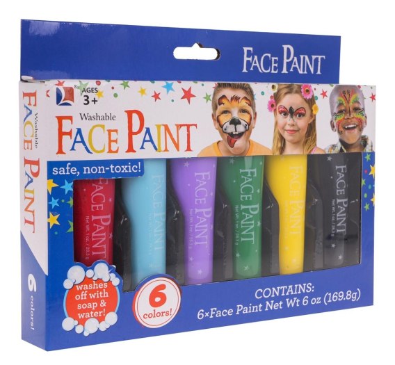 Zestaw farb do malowania twarzy dla dzieci od 3-go roku życia. Farbki do twarzy wykonano z bezpiecznych dla dziecka, nietoksycznych materiałów. Są łatwe do zmycia, wystarczy woda z mydłem. W zestawie znajduje się 6 tubek farby do twarzy w różnych kolorach.